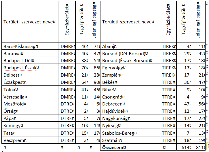 Területi szervezeteink taglétszáma a következő módon alakult: